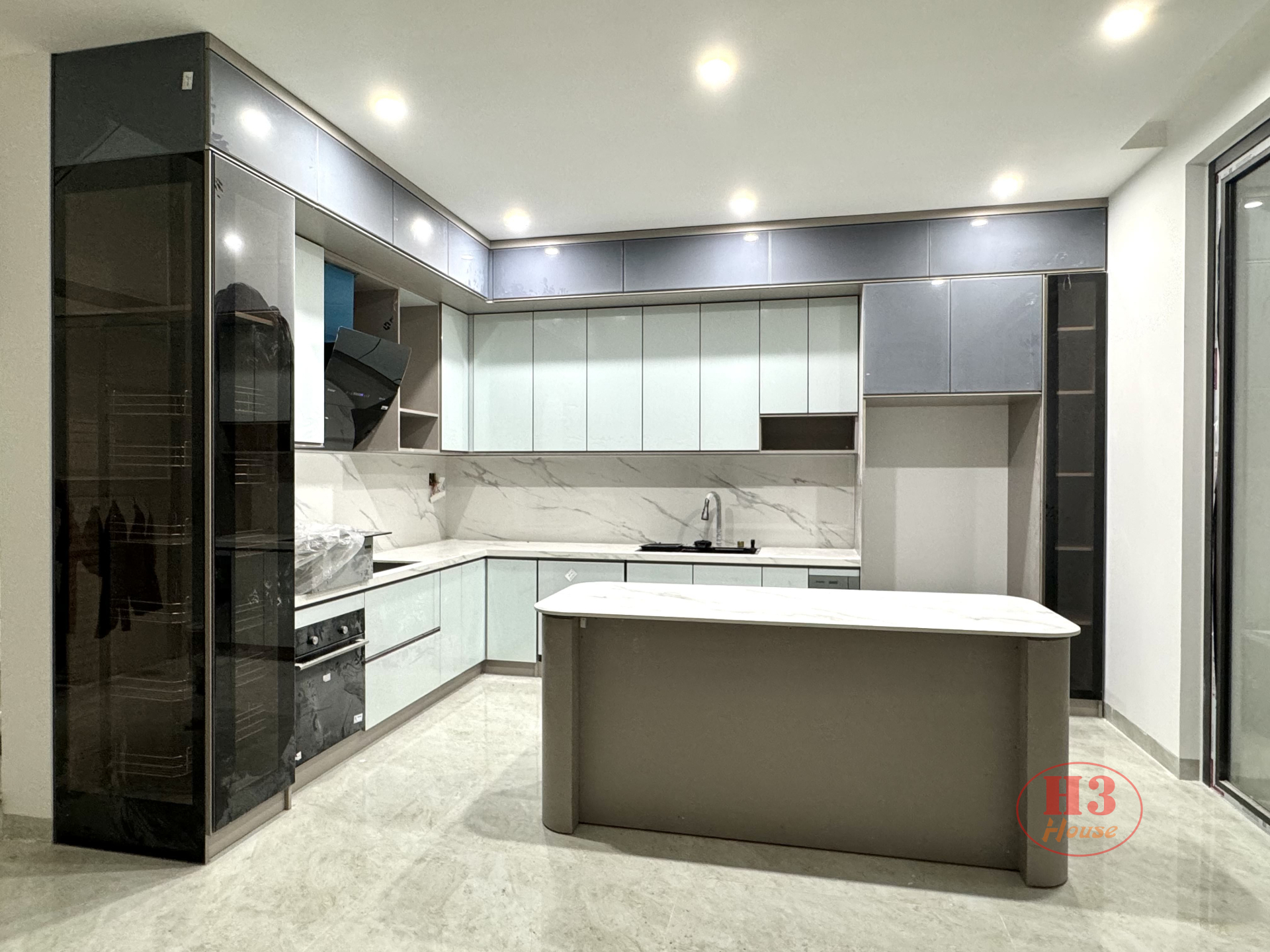 Tủ bếp nhôm hợp kim cánh kính : Toàn bộ thùng tủ làm bằng nhôm hợp kim nguyên tấm màu xám be. Cánh làm bằng khung nhôm hợp kim + kính 5ly cường lực màu xám lợt và màu trắng xanh ( màu sắc theo yêu cầu của chủ nhà) . Chống nước, chống mối mọt 100%, bền, đẹp, không có hoá chất độc hại, an toàn sức khoẻ người dùng.