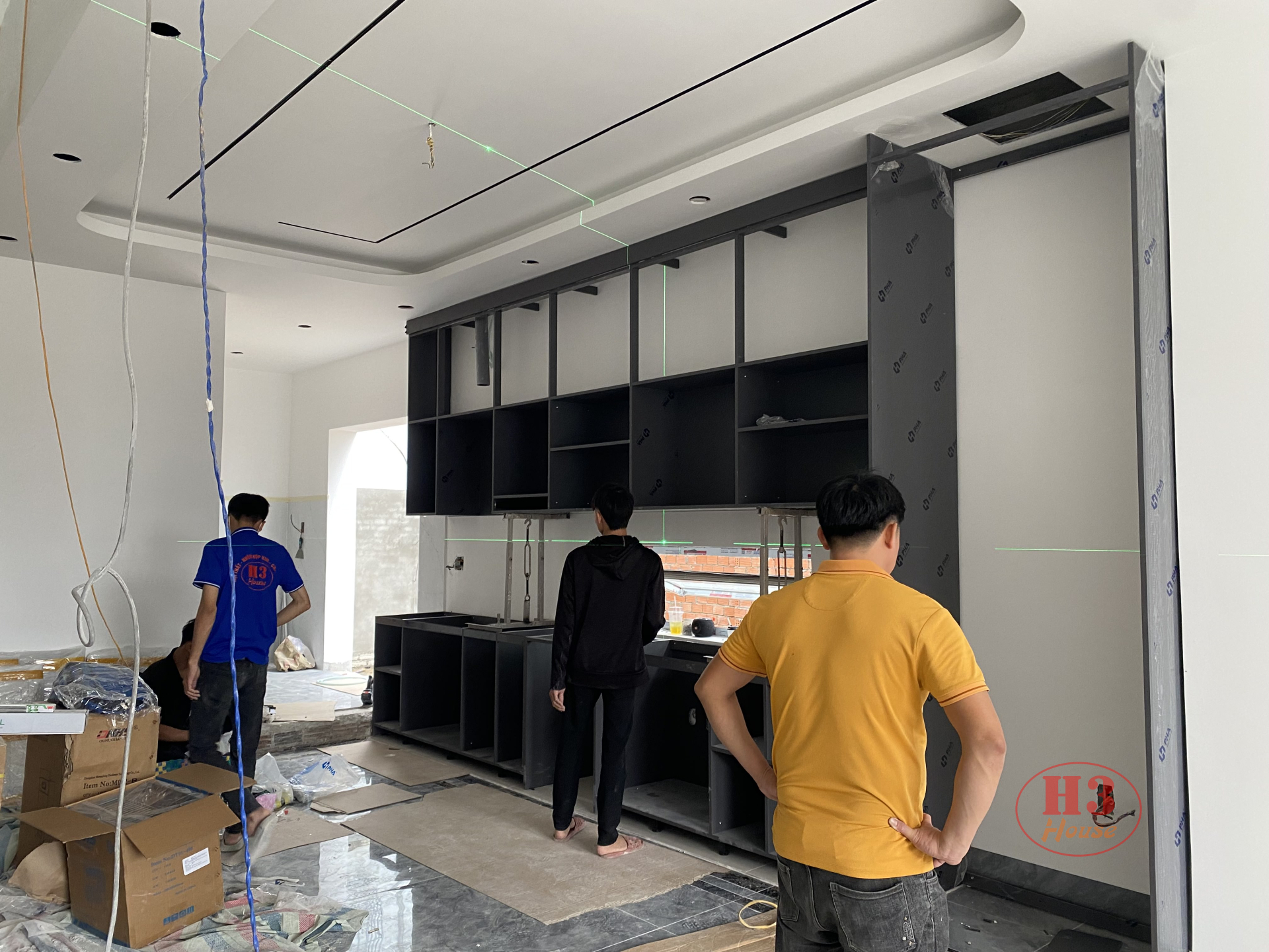 Tủ bếp nhôm hợp kim cánh kính nhà anh Thái