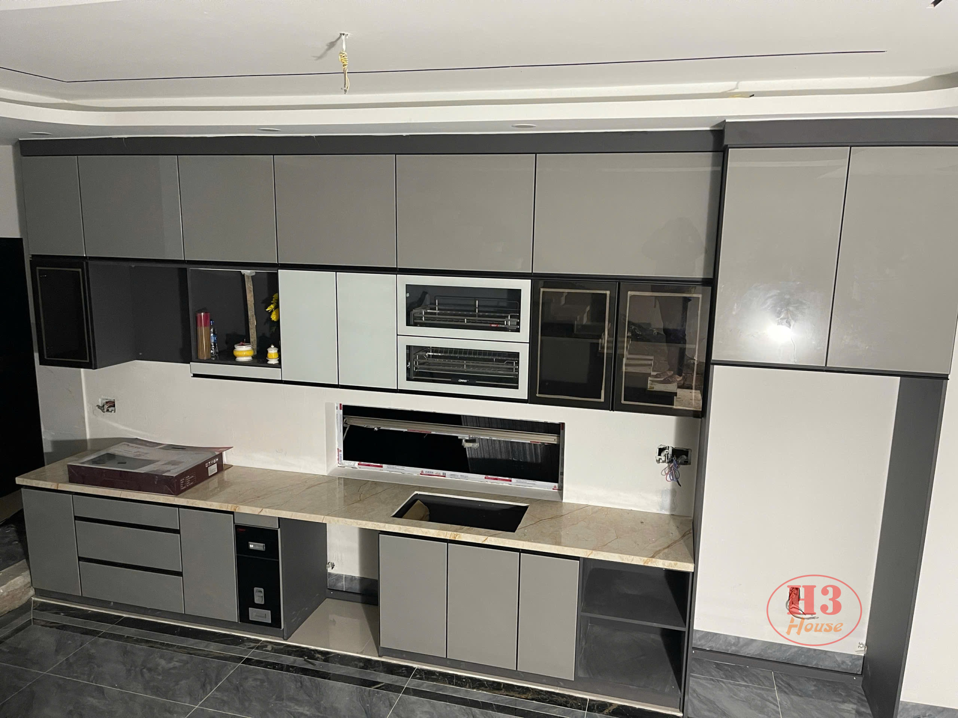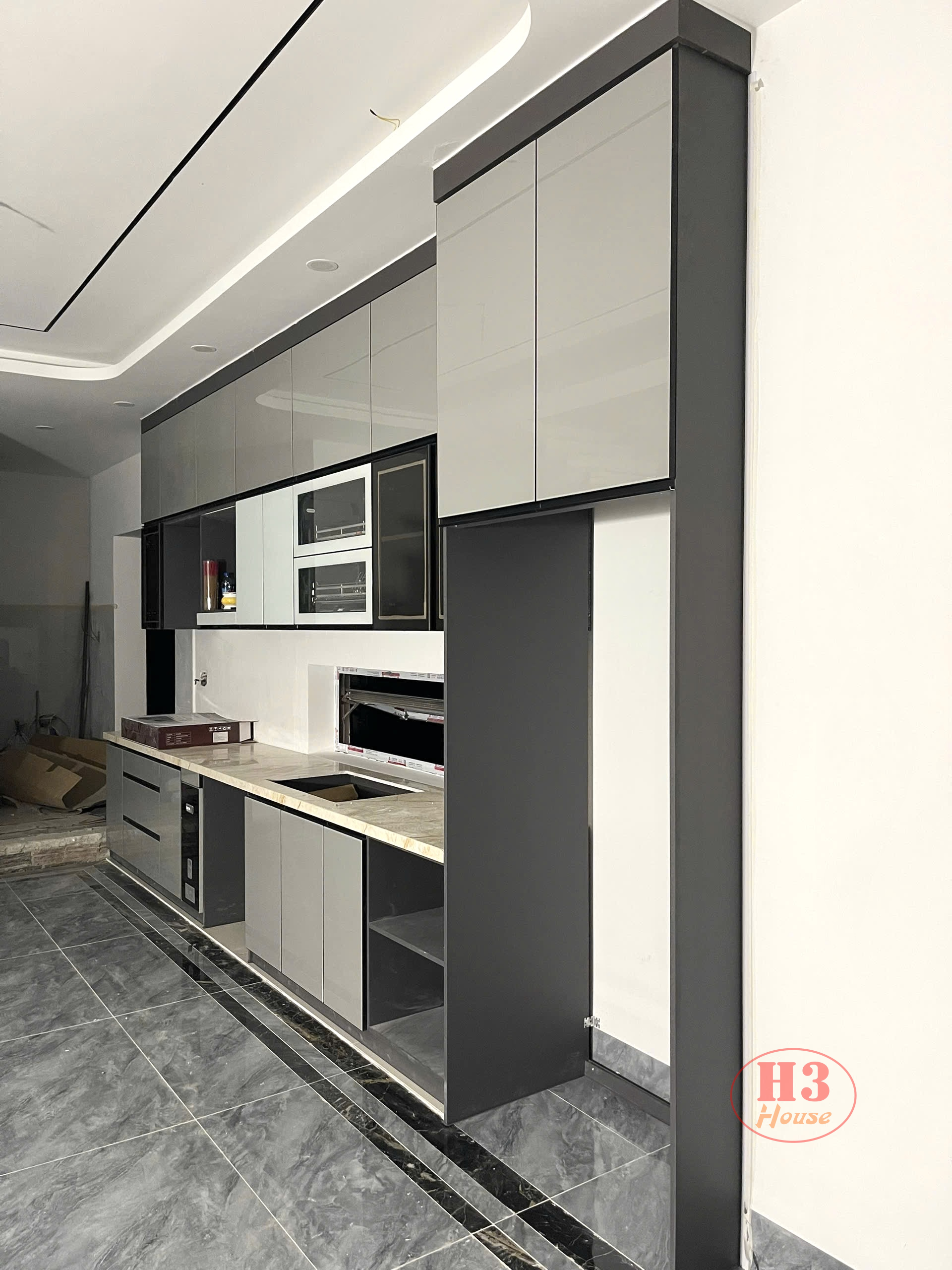 Tủ bếp nhôm hợp kim cánh kính : Toàn bộ thùng tủ làm bằng nhôm hợp kim nguyên tấm màu xám chì. Cánh làm bằng khung nhôm hợp kim + kính 5ly cường lực màu xám tro và màu trắng xanh ( màu sắc theo yêu cầu của chủ nhà) . Chống nước, chống mối mọt 100%, bền, đẹp, không có hoá chất độc hại, an toàn sức khoẻ người dùng.