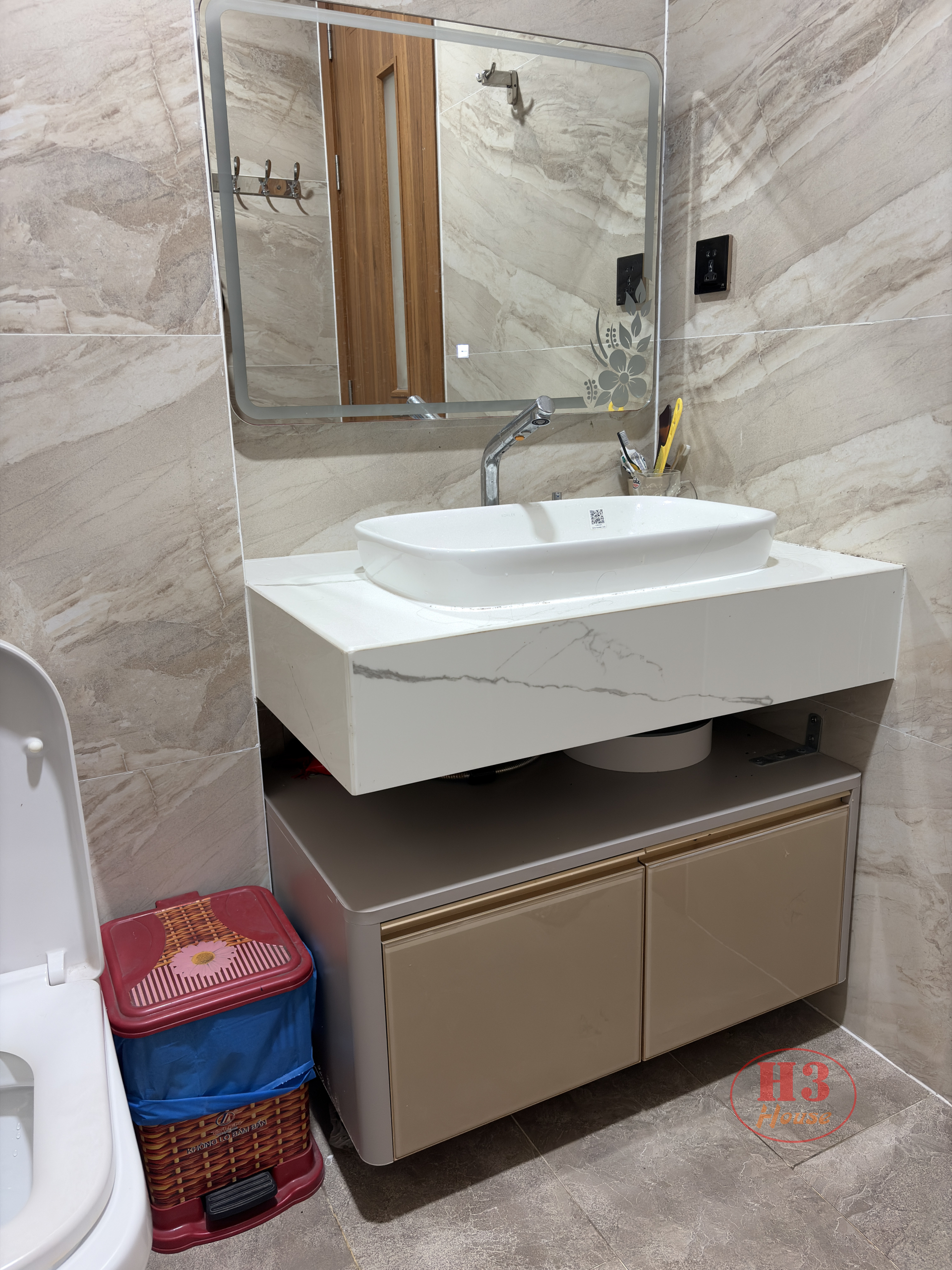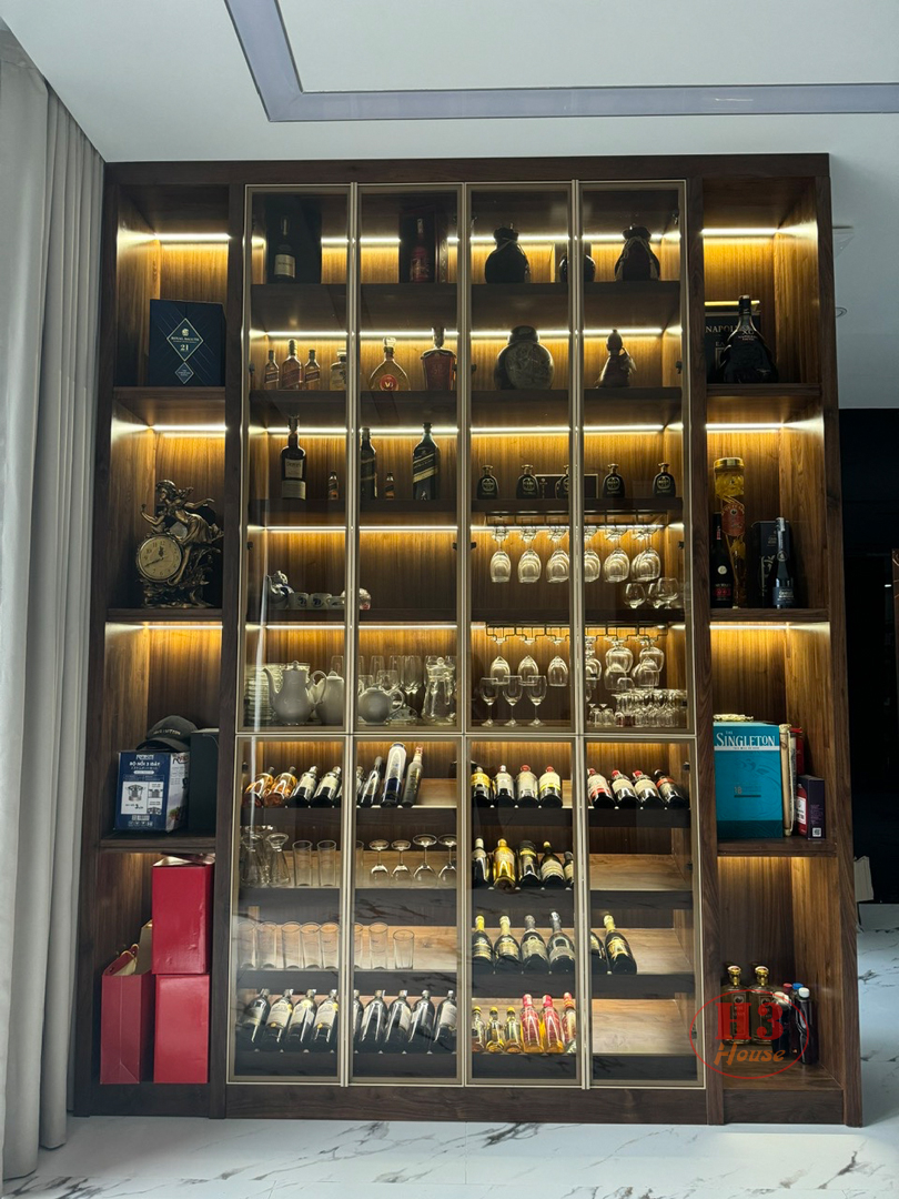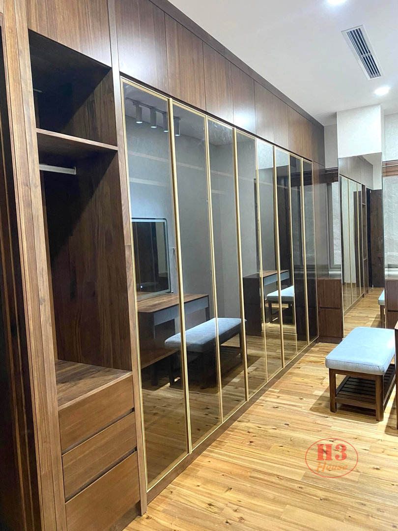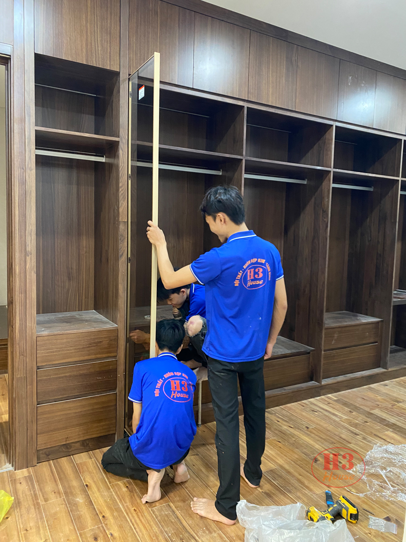 Nội thất nhôm cánh kính nhà Chị Mai: Toàn bộ thùng tủ làm bằng nhôm hợp kim nguyên tấm. Cánh làm bằng khung nhôm hợp kim + kính 5ly cường lực ( màu sắc theo yêu cầu của chủ nhà) . Chống nước, chống mối mọt 100%, bền, đẹp, không có hoá chất độc hại, an toàn sức khoẻ người dùng.