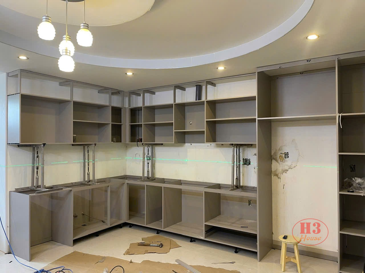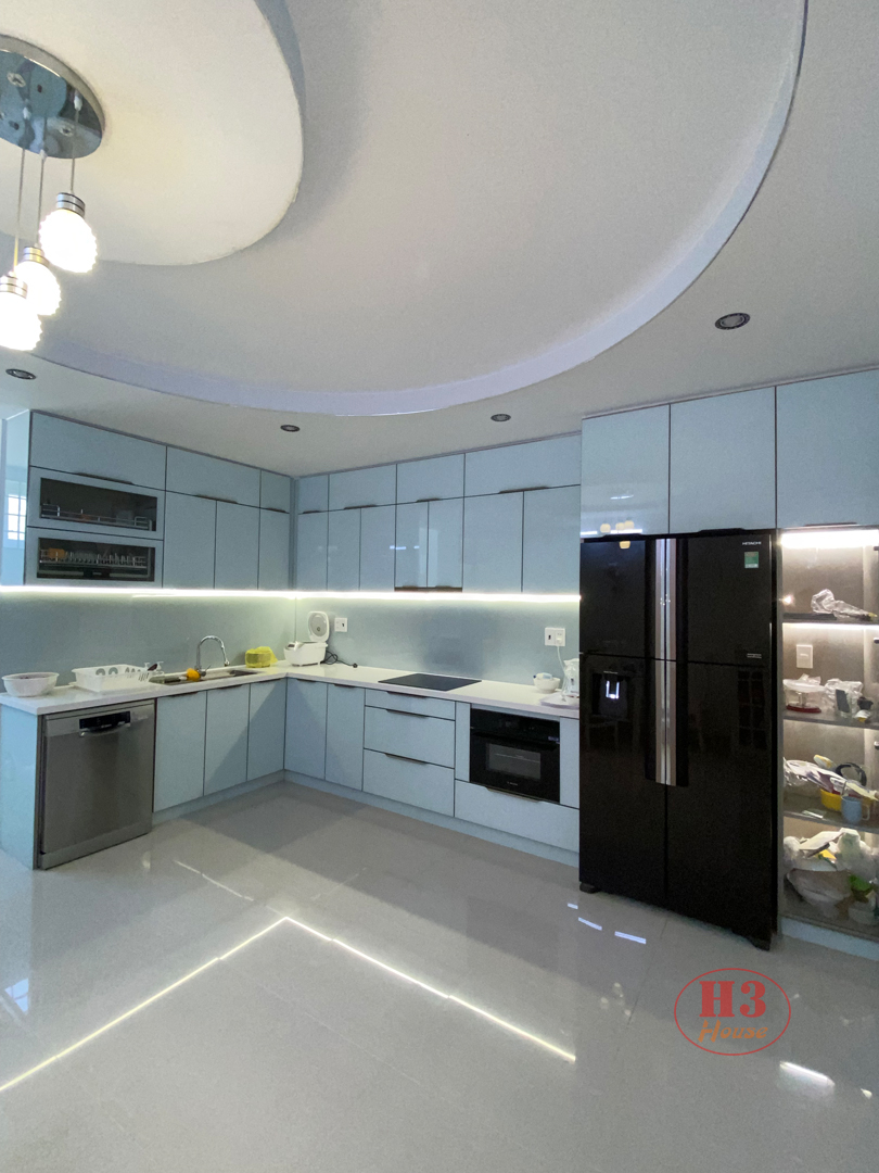 Tủ bếp và tủ lavabo nhôm cánh kính nhà chị Trang: Toàn bộ thùng tủ làm bằng nhôm hợp kim nguyên tấm màu xám be. Cánh làm bằng khung nhôm hợp kim + kính 5ly cường lực màu trắng xanh ( màu sắc theo yêu cầu của chủ nhà) . Chống nước, chống mối mọt 100%, bền, đẹp, không có hoá chất độc hại, an toàn sức khoẻ người dùng.