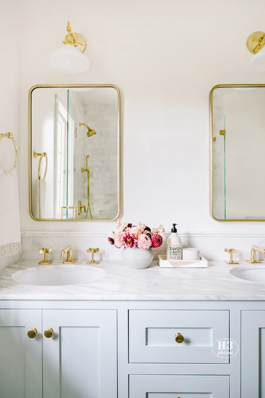 Một chiếc tủ gương vừa giúp giấu đi những món đồ nhỏ, vừa nhân đôi không gian. Bổ sung thêm những chiếc giỏ mây, khay đựng đồ bằng gỗ hoặc đá để gom nhóm các vật dụng nhỏ lại. Khi mọi thứ đều có vị trí riêng, phòng tắm sẽ tự động trở nên ngăn nắp và sang trọng.